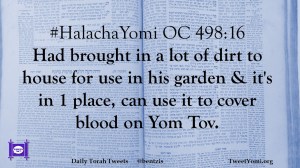 #HalachaYomi OC 498:16 Had brought in a lot of dirt to house for use in his garden & it’s in 1 place, can use it to cover blood on Yom Tov.