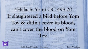 HalachaYomi #HalachaYomi OC 498:20 Date: April 25, 2019Author: ysspitz #HalachaYomi OC 498:20 If slaughtered a bird before Yom Tov & didn’t cover its blood, can’t cover the blood on Yom Tov. Share this: Share on X (Opens in new window) X Share on Facebook (Opens in new window) Facebook Like Loading... Related