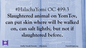 #HalachaYomi OC 499:3 Slaughtered animal on YomTov, can put skin where will be walked on, can salt lightly, but not if slaughtered before.