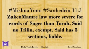 #MishnaYomi #Sanhedrin 11:3 ZakenMamre law more severe for words of Sages than Torah. Said no Tfilin, exempt. Said has 5 sections, liable.