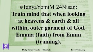 #TanyaYomiM 24Nisan: Train mind that when looking at heavens & earth & all within, outer garment of God. Emuna (faith) from Emun (training).