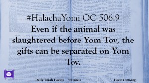 HalachaYomi #HalachaYomi OC 506:9 Date: May 6, 2019Author: ysspitz #HalachaYomi OC 506:9 Even if the animal was slaughtered before Yom Tov, the gifts can be separated on Yom Tov. Share this: Share on X (Opens in new window) X Share on Facebook (Opens in new window) Facebook Like Loading... Related