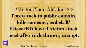 #MishnaYomi #Makot 2:2 Threw rock to public domain, kills someone, exiled. R’ EliezerBYakov: if victim stuck head after rock thrown, exempt.
