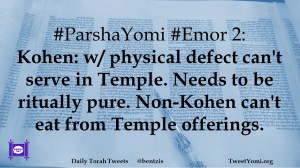 #ParshaYomi #Emor 2: Kohen: w/ physical defect can’t serve in Temple. Needs to be ritually pure. Non-Kohen can’t eat from Temple offerings.