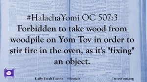 #HalachaYomi OC 507:3 Forbidden to take wood from woodpile on Yom Tov in order to stir fire in the oven, as it’s “fixing” an object.