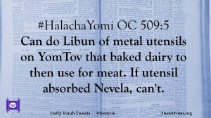 #HalachaYomi OC 509:5 Can do Libun of metal utensils on YomTov that baked dairy to then use for meat. If utensil absorbed Nevela, can’t.