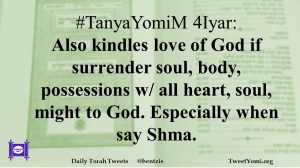 #TanyaYomiM 4Iyar: Also kindles love of God if surrender soul, body, possessions w/ all heart, soul, might to God. Especially when say Shma.