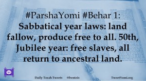 #ParshaYomi #Behar 1: Sabbatical year laws: land fallow, produce free to all. 50th, Jubilee year: free slaves, all return to ancestral land.