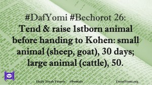 Bechorot, DafYomi #DafYomi #Bechorot 26 Date: May 14, 2019Author: ysspitz #DafYomi #Bechorot 26: Tend & raise 1stborn animal before handing to Kohen: small animal (sheep, goat), 30 days; large animal (cattle), 50. Share this: Share on X (Opens in new window) X Share on Facebook (Opens in new window) Facebook Like Loading... Related