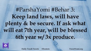 #ParshaYomi #Behar 3: Keep land laws, will have plenty & be secure. If ask what will eat 7th year, will be blessed 6th year w/ 3x produce.
