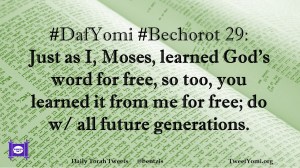 Bechorot, DafYomi #DafYomi #Bechorot 29 Date: May 18, 2019Author: ysspitz #DafYomi #Bechorot 29: Just as I, Moses, learned God’s word for free, so too, you learned it from me for free; do w/ all future generations. Share this: Share on X (Opens in new window) X Share on Facebook (Opens in new window) Facebook Like Loading... Related