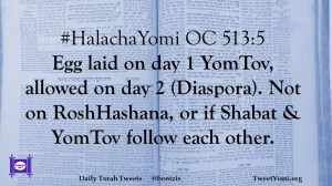 #HalachaYomi OC 513:5 Egg laid on day 1 YomTov, allowed on day 2 (Diaspora). Not on RoshHashana, or if Shabat & YomTov follow each other.