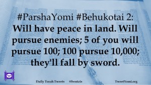 #ParshaYomi #Behukotai 2: Will have peace in land. Will pursue enemies; 5 of you will pursue 100; 100 pursue 10,000; they’ll fall by sword.