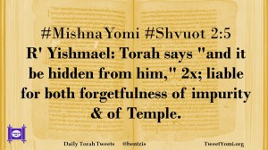 #MishnaYomi #Shvuot 2:5 R’ Yishmael: Torah says “and it be hidden from him,” 2x; liable for both forgetfulness of impurity & of Temple.