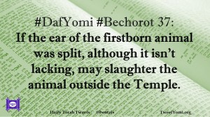 Bechorot, DafYomi #DafYomi #Bechorot 37 Date: May 24, 2019Author: ysspitz #DafYomi #Bechorot 37: If the ear of the firstborn animal was split, although it isn’t lacking, may slaughter the animal outside the Temple. Share this: Share on X (Opens in new window) X Share on Facebook (Opens in new window) Facebook Like Loading... Related