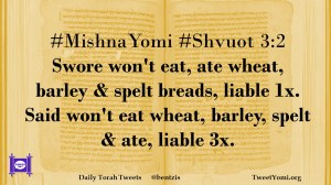 #MishnaYomi #Shvuot 3:2 Swore won’t eat, ate wheat, barley & spelt breads, liable 1x. Said won’t eat wheat, barley, spelt & ate, liable 3x.