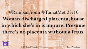 #RambamYomi #TumatMet 25:10 Woman discharged placenta, house in which she’s in is impure. Presume there’s no placenta without a fetus.