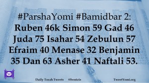 #ParshaYomi #Bamidbar 2: Ruben 46k Simon 59 Gad 46 Juda 75 Isahar 54 Zebulun 57 Efraim 40 Menase 32 Benjamin 35 Dan 63 Asher 41 Naftali 53.