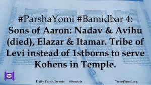 #ParshaYomi #Bamidbar 4: Sons of Aaron: Nadav & Avihu (died), Elazar & Itamar. Tribe of Levi instead of 1stborns to serve Kohens in Temple.