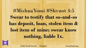 #MishnaYomi #Shvuot 4:5 Swear to testify that so-and-so has deposit, loan, stolen item & lost item of mine; swear know nothing, liable 1x.