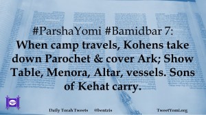 #ParshaYomi #Bamidbar 7: When camp travels, Kohens take down Parochet & cover Ark; Show Table, Menora, Altar, vessels. Sons of Kehat carry.