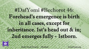 Bechorot, DafYomi #DafYomi #Bechorot 46 Date: June 3, 2019Author: ysspitz #DafYomi #Bechorot 46: Forehead’s emergence is birth in all cases, except for inheritance. 1st’s head out & in; 2nd emerges fully – 1stborn. Share this: Share on X (Opens in new window) X Share on Facebook (Opens in new window) Facebook Like Loading... Related