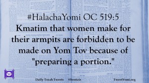 #HalachaYomi OC 519:5 Kmatim that women make for their armpits are forbidden to be made on Yom Tov because of “preparing a portion.”