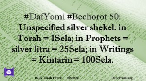 Bechorot, DafYomi #DafYomi #Bechorot 50 Date: June 7, 2019Author: ysspitz #DafYomi #Bechorot 50: Unspecified silver shekel: in Torah = 1Sela; in Prophets = silver litra = 25Sela; in Writings = Kintarin = 100Sela. Share this: Share on X (Opens in new window) X Share on Facebook (Opens in new window) Facebook Like Loading... Related