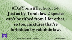 Bechorot, DafYomi #DafYomi #Bechorot 54 Date: June 7, 2019Author: ysspitz #DafYomi #Bechorot 54: Just as by Torah law 2 species can’t be tithed from 1 for other, so too, mixtures that’re forbidden by rabbinic law. Share this: Share on X (Opens in new window) X Share on Facebook (Opens in new window) Facebook Like Loading... Related