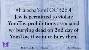 #HalachaYomi OC 526:4 Jew is permitted to violate YomTov prohibitions associated w/ burying dead on 2nd day of YomTov, if want to bury then.