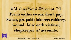 #MishnaYomi #Shvuot 7:1 Torah oaths: swear, don’t pay. Swear, get paid: laborer; robbery, wound, false oath victims; shopkeeper w/ accounts.