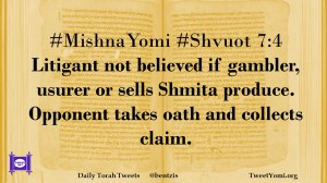 #MishnaYomi #Shvuot 7:4 Litigant not believed if gambler, usurer or sells Shmita produce. Opponent takes oath and collects claim.