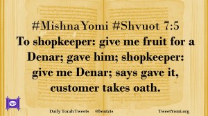 #MishnaYomi #Shvuot 7:5 To shopkeeper: give me fruit for a Denar; gave him; shopkeeper: give me Denar; says gave it, customer takes oath.