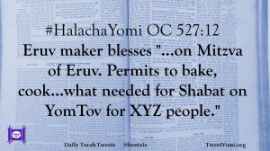 #HalachaYomi OC 527:12 Eruv maker blesses “…on Mitzva of Eruv. Permits to bake, cook…what needed for Shabat on YomTov for XYZ people.”