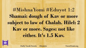#MishnaYomi #Eduyot 1:2 Shamai: dough of Kav or more subject to law of Chalah. Hilel: 2 Kav or more. Sages: not like either. It’s 1.5 Kav.