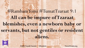 #RambamYomi #TumatTzaraat 9:1 All can be impure of Tzaraat blemishes, even a newborn baby or servants, but not gentiles or resident aliens.