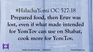 #HalachaYomi OC 527:18 Prepared food, then Eruv was lost, even if what made intended for YomTov can use on Shabat, cook more for YomTov.
