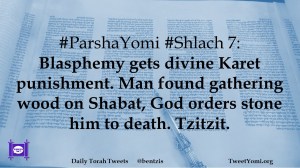 #ParshaYomi #Shlach 7: Blasphemy gets divine Karet punishment. Man found gathering wood on Shabat, God orders stone him to death. Tzitzit.
