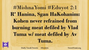 #MishnaYomi #Eduyot 2:1 R’ Hanina, Sgan HaKohanim: Kohen never refrained from burning meat defiled by Vlad Tuma w/ meat defiled by Av Tuma.