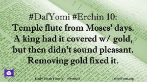DafYomi, Erchin #DafYomi #Erchin 10 Date: June 26, 2019Author: ysspitz #DafYomi #Erchin 10: Temple flute from Moses’ days. A king had it covered w/ gold, but then didn’t sound pleasant. Removing gold fixed it. Share this: Share on X (Opens in new window) X Share on Facebook (Opens in new window) Facebook Like Loading... Related