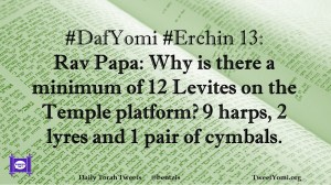 DafYomi, Erchin #DafYomi #Erchin 13 Date: June 28, 2019Author: ysspitz #DafYomi #Erchin 13: Rav Papa: Why is there a minimum of 12 Levites on the Temple platform? 9 harps, 2 lyres and 1 pair of cymbals. Share this: Share on X (Opens in new window) X Share on Facebook (Opens in new window) Facebook Like Loading... Related