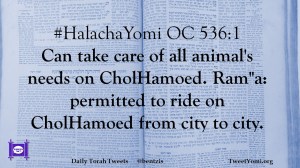 #HalachaYomi OC 536:1 Can take care of all animal’s needs on CholHamoed. Ram”a: permitted to ride on CholHamoed from city to city.