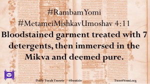 #RambamYomi #MetameiMishkavUmoshav 4:11 Bloodstained garment treated with 7 detergents, then immersed in the Mikva and deemed pure.