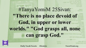 TanyaYomiM #TanyaYomiM 25Sivan Date: June 28, 2019Author: ysspitz #TanyaYomiM 25Sivan: “There is no place devoid of God, in upper or lower worlds.” “God grasps all, none can grasp God.” Share this: Share on X (Opens in new window) X Share on Facebook (Opens in new window) Facebook Like Loading... Related