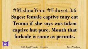 #MishnaYomi #Eduyot 3:6 Sages: female captive may eat Truma if she says was taken captive but pure. Mouth that forbade is same as permits.
