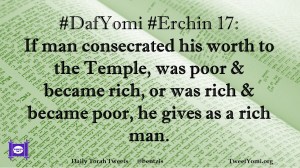 DafYomi, Erchin #DafYomi #Erchin 17 Date: July 4, 2019Author: ysspitz #DafYomi #Erchin 17: If man consecrated his worth to the Temple, was poor & became rich, or was rich & became poor, he gives as a rich man. Share this: Share on X (Opens in new window) X Share on Facebook (Opens in new window) Facebook Like Loading... Related