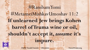 #RambamYomi #MetameiMishkavUmoshav 11:2 If unlearned Jew brings Kohen barrel of Truma wine or oil, shouldn’t accept it, assume it’s impure.