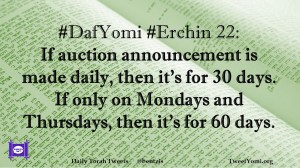 DafYomi, Erchin #DafYomi #Erchin 22 Date: July 8, 2019Author: ysspitz #DafYomi #Erchin 22: If auction announcement is made daily, then it’s for 30 days. If only on Mondays and Thursdays, then it’s for 60 days. Share this: Share on X (Opens in new window) X Share on Facebook (Opens in new window) Facebook Like Loading... Related
