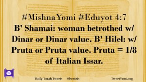 #MishnaYomi #Eduyot 4:7 B’ Shamai: woman betrothed w/ Dinar or Dinar value. B’ Hilel: w/ Pruta or Pruta value. Pruta = 1/8 of Italian Issar.