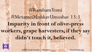 #RambamYomi #MetameiMishkavUmoshav 13:3 Impurity in front of olive-press workers, grape harvesters, if they say didn’t touch it, believed.